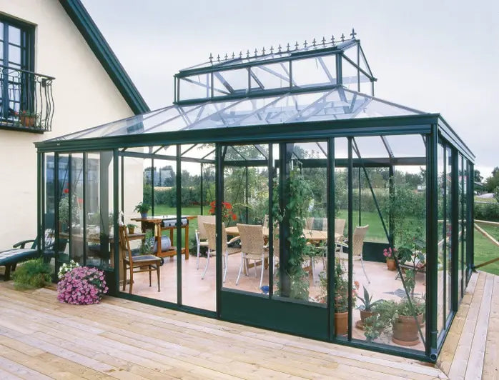 De Royal is een pareltje. Haar smalle profielen en brede, dubbele schuifdeur in combinatie met een lichtkoepel met Victoriaanse nokversiering vormen een decoratief geheel. Dit prachtig glazen huisje is geschikt voor elk relaxmoment en de kroon op elk tuinfeestje.