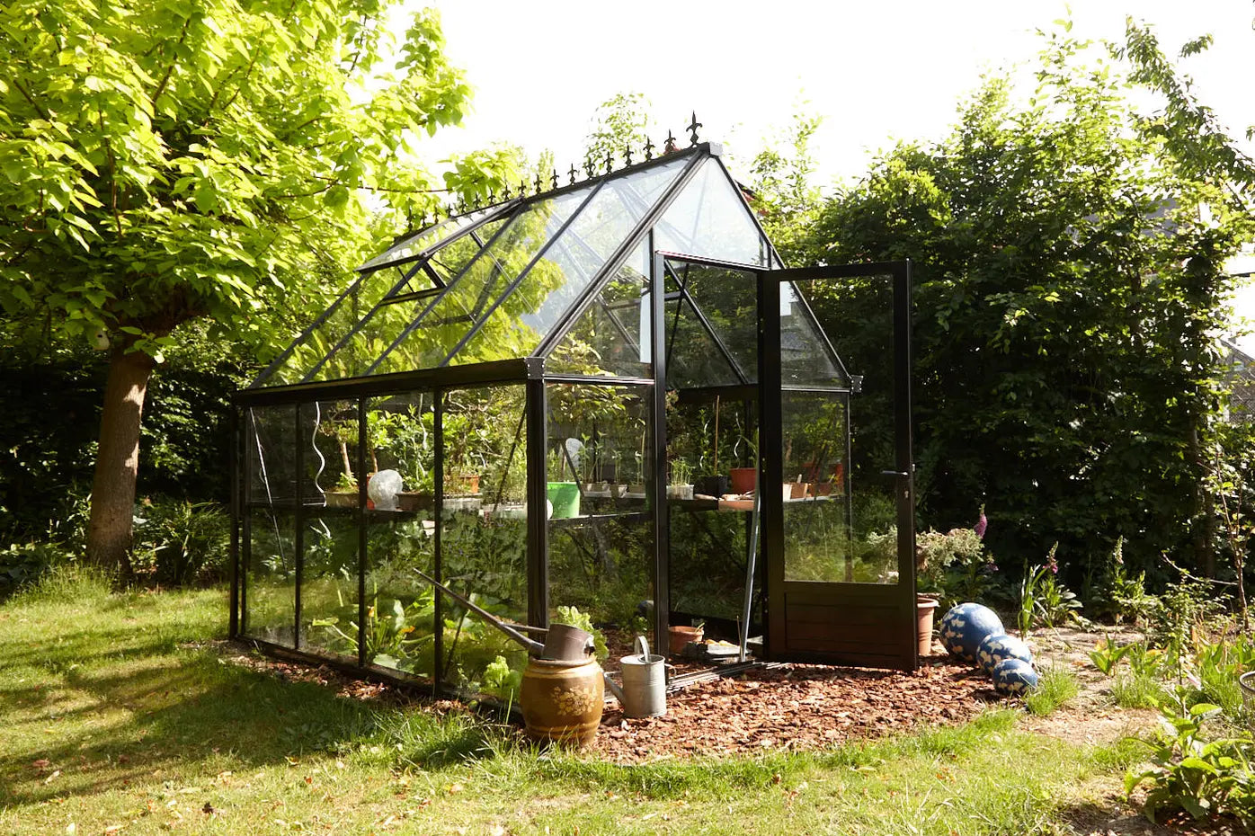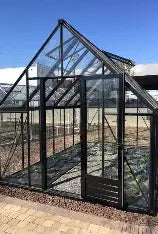 Met zijn sierlijke 45-graden hellend dak voegt deze serre een vleugje luxe toe aan elke tuin. De schuine daklijn creëert een ruimtelijk gevoel, terwijl de goothoogte van 1,65 m zorgt voor een intieme en gezellige sfeer. Dankzij de extra hoge draaideur stap je vlot naar binnen.