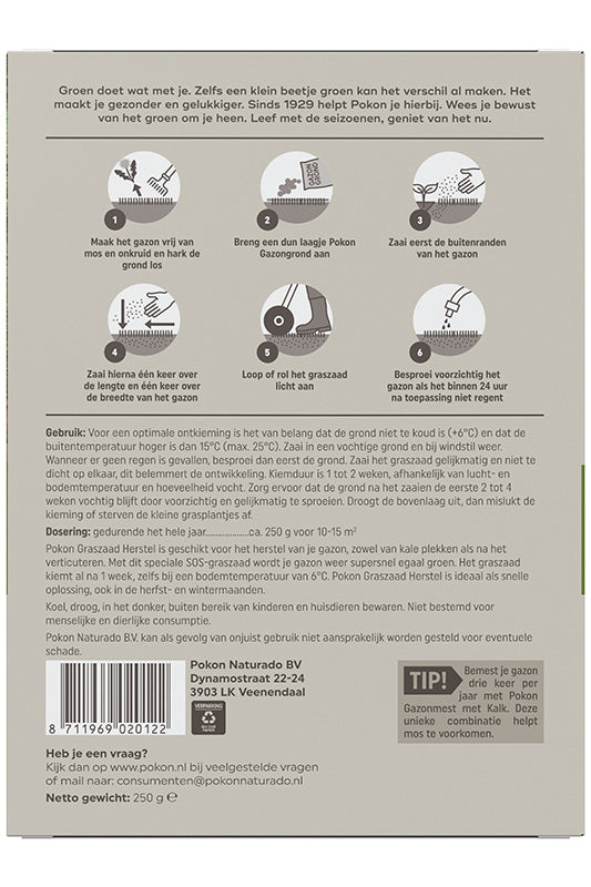Pokon Graszaad Herstel is geschikt voor het herstel van je gazon, zowel van kale plekken als na het verticuteren. Met dit speciale SOS-graszaad wordt je gazon weer supersnel egaal groen. Het graszaad kiemt al na 1 week, zelfs bij een bodemtemperatuur van 6°C. Pokon Graszaad Herstel is ideaal als snelle oplossing, ook in de herfst- en wintermaanden. Voor een optimale ontkieming is het van belang dat de grond niet te koud is (+6°C.) en dat de buitentemperatuur hoger is dag 15°C (max 25°C). Zaai in een vochtige grond en bij windstil weer. Wanneer er geen regen is gevallen, besproei dan eerst de grond. Zaai het graszaad gelijkmatig en niet te dicht op elkaar, dit belemmert de ontwikkeling. Kiemduur is 1 tot 2 weken, afhankelijk van lucht- en bodemtemperatuur en hoeveelheid vocht. Zorg ervoor dat de grond na het zaaien de eerste 2 tot 4 weken vochtig blijft door voorzichtig en gelijkmatig te sproeien. Droogt de bovenlaag uit, dan mislukt de kieming of sterven de kleine grasplantjes af.