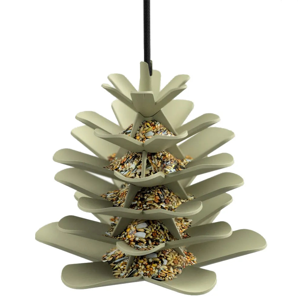 Dennenappel gemaakt van 98% gerecycled kunststof die makkelijk te vullen en op te hangen is. Zo hebben alle vogels in de tuin iets te eten in de winter.